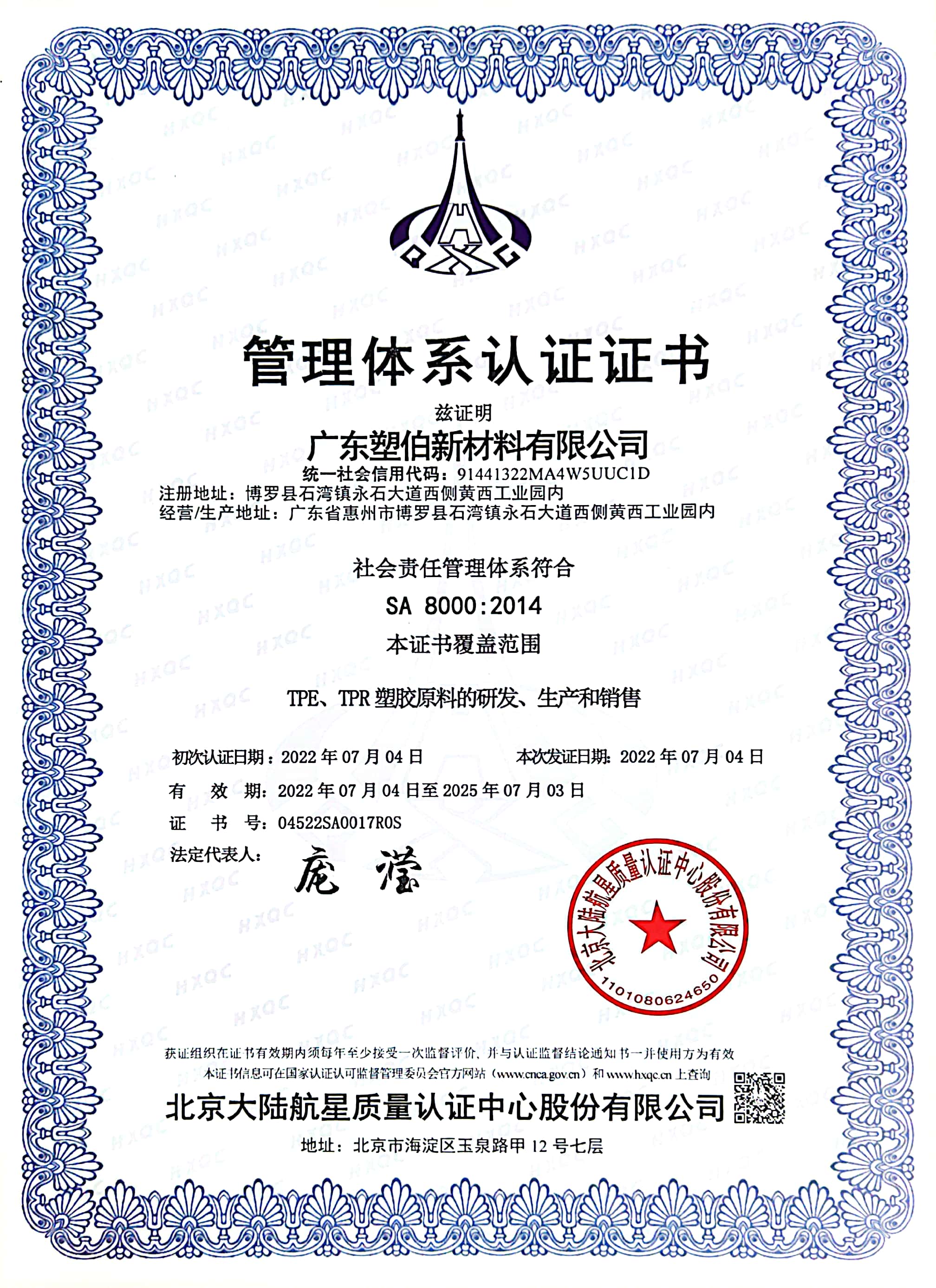 塑伯公司榮獲SA8000:2014社會責(zé)任體系認證
